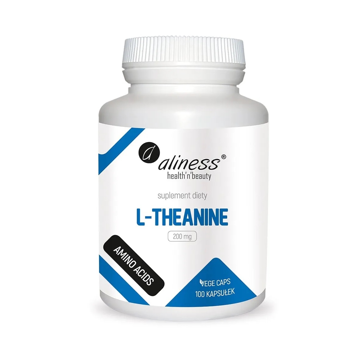 Aliness L-Theanine 200 mg kapsułki z L-teaniną wspierającą relaks, koncentrację i komfort psychiczny. Odpowiednie dla wegan i wegetarian, bez konserwantów.