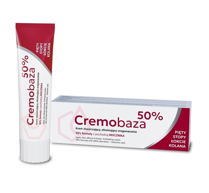 CREMOBAZA krem o właściwościach złuszczających, stworzony do eliminacji zrogowaceń. Jest to kosmetyk odpowiedni dla każdego typu skóry, dedykowany do stosowania wyłącznie na zrogowaciałe i pękające miejsca takie jak kolana, łokcie, stopy i pięty. Krem zawiera 50% stabilnej pochodnej mocznika, która skutecznie wspomaga proces złuszczania skóry.