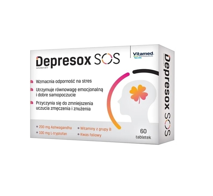 DEPRESOX SOS to nowoczesny suplement diety w formie tabletek, zaprojektowany w celu wsparcia zdrowia psychicznego i emocjonalnej równowagi. Dzięki zawartości ekstraktu z korzenia Ashwagandhy, witamin z grupy B (B1, B2, B6, B12), L-tryptofanu i kwasu foliowego, pomaga zmniejszyć stres, zmęczenie i poprawić nastrój. Idealny dla osób dorosłych, które chcą wspierać swoje samopoczucie w trudnych chwilach, zarządzać stresem oraz poprawić równowagę emocjonalną.