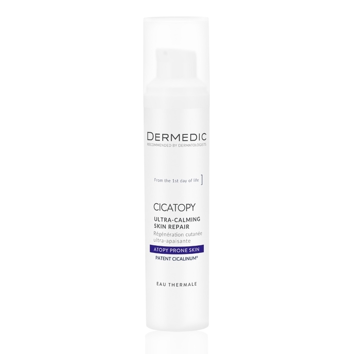 DERMEDIC CICATOPY Krem ultrakojący naprawczy przynosi natychmiastową i długotrwałą ulgę bardzo suchej, atopowej i podrażnionej skórze dorosłych i dzieci od 1. dnia życia. Zawiera opatentowany kompleks Cicalinum® z kwasami omega 3, 6, 9, fitosterolami i beta-glukanem, który łagodzi objawy egzemy, wspiera regenerację skóry i równoważy mikrobiom.