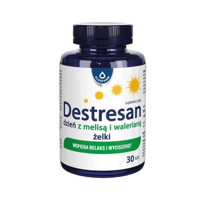 Destresan Dzień z Melisą i Walerianą to cytrynowe żelki wspierające relaks, dobre samopoczucie i odporność na stres. Zawierają L-teaninę, witaminę B6 oraz ekstrakty roślinne z melisy, różeńca górskiego i kozłka lekarskiego.