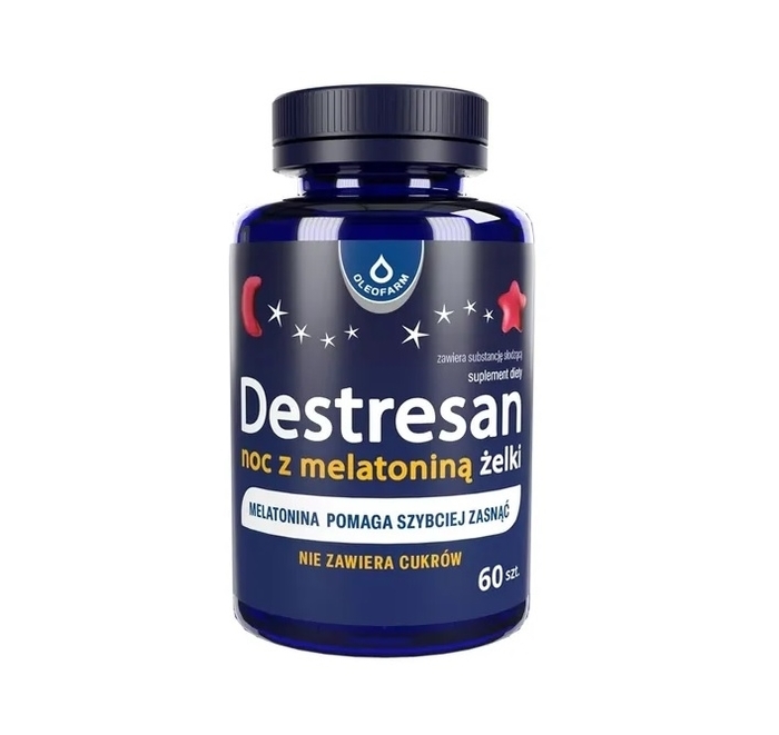 Destresan Noc z Melatoniną to suplement diety w formie żelków o smaku wiśniowym. Zawiera ekstrakty z melisy i chmielu, melatoninę, witaminę B6 i witaminę C. Wspiera relaks, ułatwia zasypianie i pomaga w utrzymaniu spokojnego snu.