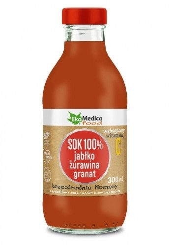 EKAMEDICA żurawina granat to pasteryzowany sok wyprodukowany częściowo z soków zagęszczonych. Występuje naturalne zmętnienie.