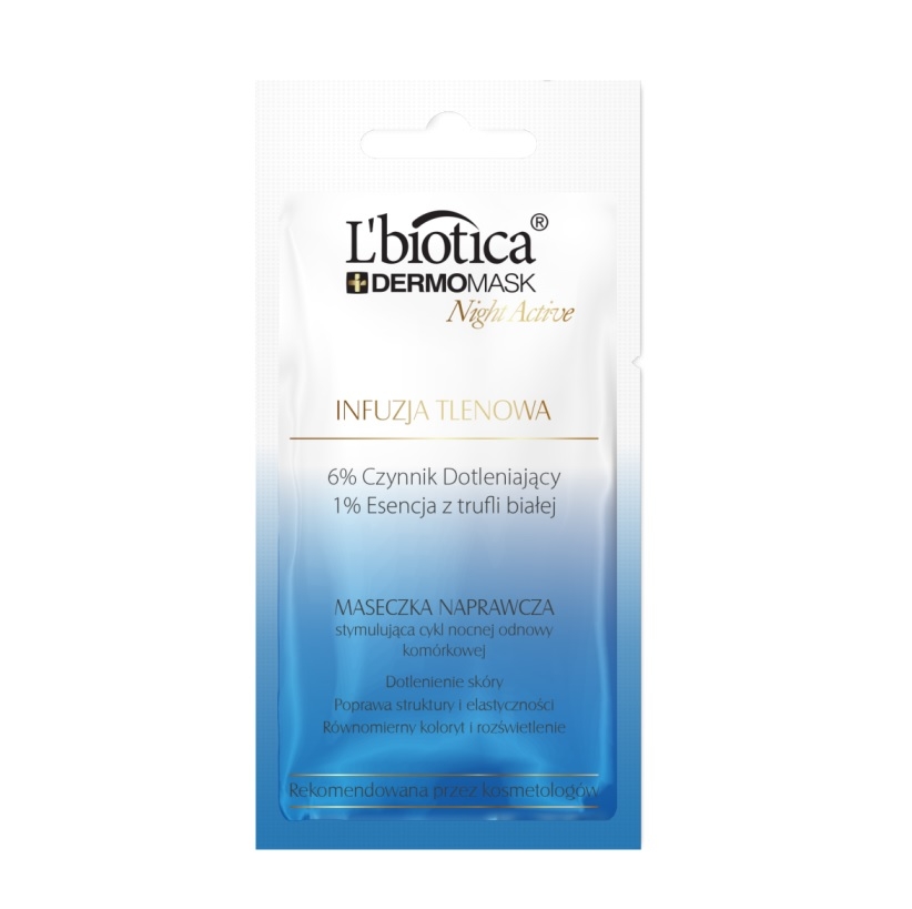 L'BIOTICA DERMOMASK Night Active INFUZJA TLENOWA Maseczka naprawcza to luksusowa maseczka naprawcza na noc, stworzona z myślą o intensywnej regeneracji i odnowie skóry w czasie snu. Wykorzystuje naturalny rytm nocnej odnowy komórkowej, by przywrócić cerze świeżość, energię i młodzieńczy blask — z efektem porównywalnym do profesjonalnych zabiegów kosmetycznych. Formuła maseczki została wzbogacona o 6% Czynnika Dotleniającego, który stymuluje oddychanie mitochondrialne i poprawia komunikację między komórkami skóry. Dzięki temu komórki są lepiej dotlenione, co przekłada się na ich prawidłowe funkcjonowanie, poprawę napięcia oraz redukcję oznak zmęczenia. Składnik ten jednocześnie hamuje proces glikacji, zapobiegając degradacji włókien kolagenowych odpowiedzialnych za jędrność skóry. Dodatkowo w recepturze znalazł się 2% kompleks Detoxium™ – substancja aktywna o działaniu oczyszczającym i detoksykującym. Detoxium™ wspiera system samooczyszczania komórek skóry, usuwając toksyny i zanieczyszczenia, które przyspieszają proces starzenia. Dzięki temu skóra staje się czystsza, bardziej promienna i odzyskuje zdrowy koloryt. Całość dopełnia szlachetna esencja z Białej Trufli, która nadaje skórze aksamitną gładkość, odżywia i przywraca jej naturalny blask. Po nocy z maseczką Dermomask Night Active Infuzja Tlenowa skóra wygląda na wypoczętą, zregenerowaną i pełną życia.