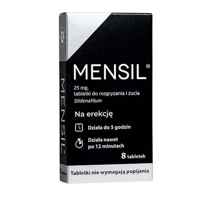 MENSIL to najwyżej ceniony lek na erekcję który nie wymaga popijania i działa już po 12 minutach aż do 5 godzin! Dyskretna tabletka w formie do rozgryzania, szybko rozpuszcza się w ustach i posiada przyjemny miętowy smak. Substancją aktywną leku jest sildenafil, który szybko i skutecznie działa, zapewniając długotrwałe efekty.