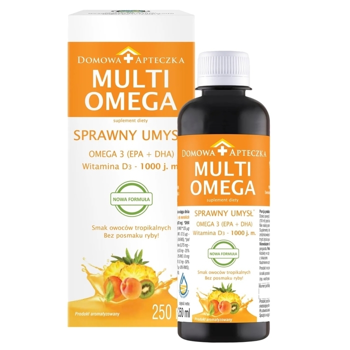 MULTIOMEGA to płynny suplement diety będący połączeniem certyfikowanego oleju z ryb morskich, bogatego w kwasy omega-3 (EPA i DHA), oraz 9 cennych witamin uzupełnionych o cynk i jod. Preparat charakteryzuje się pysznym smakiem owoców tropikalnych, bez posmaku oleju rybiego, dzięki czemu może być stosowany przez dorosłych i dzieci powyżej 3. roku życia. Produkt został wytworzony w unikalnej technologii EmulOil®, zapewniającej optymalne wchłanianie składników aktywnych. Olej z ryb pochodzi z Islandii, pozyskiwany z poszanowaniem środowiska naturalnego. Regularne spożywanie DHA w ilości 250 mg dziennie wspiera prawidłowe funkcjonowanie mózgu oraz utrzymanie prawidłowego widzenia, natomiast DHA i EPA w łącznej ilości 250 mg dziennie wspomagają prawidłowe funkcjonowanie serca. Cynk wspiera funkcje poznawcze, prawidłowe widzenie oraz metabolizm witaminy A, natomiast jod wspomaga prawidłowy wzrost dzieci i funkcjonowanie układu nerwowego. Witaminy z grupy B (niacyna, ryboflawina, foliany, tiamina, witamina B6 i biotyna) zmniejszają uczucie zmęczenia i wspierają prawidłowe funkcje psychologiczne. Dodatkowo witamina D i K wspierają zdrowie kości, a witamina D, cynk i foliany pomagają utrzymać prawidłową odporność organizmu. MULTIOMEGA to kompleksowe wsparcie dla mózgu, serca, wzroku, układu odpornościowego i kości w jednej, łatwej do spożycia formie.