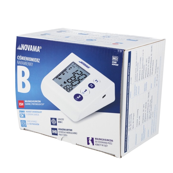 NOVAMA B to ciśnieniomierz naramienny o kompaktowej budowie i intuicyjnej obsłudze. Kliniczna dokładność, wykrywanie arytmii, pamięć dla 2 użytkowników, zasilanie USB-C lub bateriami.