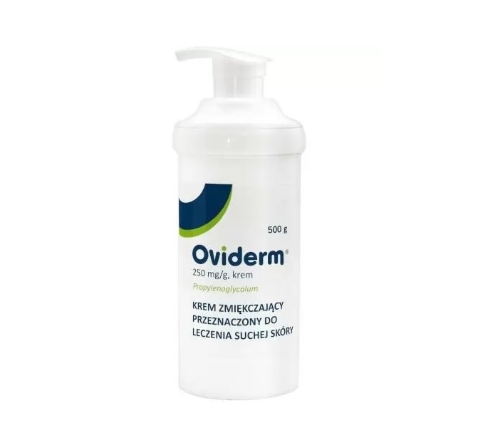 OVIDERM to krem zmiękczający skórę, który zawiera substancję zwaną glikolem propylenowym (25%). Glikol propylenowy ma właściwości wiązania wody i także w niewielkim stopniu działa przeciwdrobnoustrojowo, działa na niektóre bakterie i grzyby. Oviderm przeznaczony jest do leczenia suchej skóry w przypadku występowania np. atopowego zapalenia skóry, łuszczycy, rybiej łuski (ichtioza), grzybica skóry.