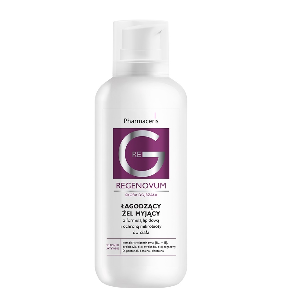 PHARMACERIS G REGENOVUM ŁAGODZĄCY ŻEL MYJĄCY to preparat przeznaczony do codziennej pielęgnacji nadmiernie przesuszonej i wrażliwej skóry dojrzałej. Skutecznie oczyszcza ciało, nie naruszając naturalnej równowagi hydrolipidowej skóry, dzięki łagodnej bazie myjącej i fizjologicznemu pH. Formuła wzbogacona olejem awokado i olejem arganowym odżywia, wygładza i poprawia elastyczność skóry, a obecność nienasyconych kwasów tłuszczowych Omega 6 i 9 odbudowuje barierę lipidową. Kompleks łagodzących składników (D-pantenol, betaina, alantoina) niweluje podrażnienia, zaczerwienienia i uczucie swędzenia. Probiotyk przywraca równowagę mikrobioty, a witamina B12 działa antyoksydacyjnie, poprawiając jędrność i wygląd skóry. Żel nie zawiera alkoholu i nie wysusza skóry, zapewniając komfort i odpowiedni poziom nawilżenia.