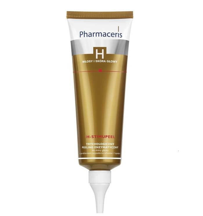 PHARMACERIS H H-STIMUPEEL TRYCHOLOGICZNY PEELING ENZYMATYCZNY do skóry głowy to specjalistyczny preparat do dogłębnego oczyszczania skóry głowy, opracowany z myślą o osobach z problemem wypadania włosów, przerzedzenia, łysienia, łupieżu oraz łojotokowego zapalenia skóry (ŁZS). Delikatna, trychologiczna formuła skutecznie usuwa zanieczyszczenia, nadmiar sebum i martwy naskórek, odblokowując ujścia mieszków włosowych i przywracając skórze głowy naturalną równowagę. Kompleks enzymów złuszczających – kwasy AHA (glikolowy i mlekowy), papaina i bromelaina – działa oczyszczająco i przeciwłupieżowo, zmniejszając przetłuszczanie się włosów oraz zapobiegając nawrotom problemu. Zawarta kofeina poprawia mikrokrążenie, dotlenia komórki i stymuluje wzrost włosów, ograniczając ich wypadanie. Innowacyjny kompleks MaHo o działaniu kojącym i antyoksydacyjnym wspiera naturalną mikrobiotę skóry głowy, łagodzi podrażnienia i nadwrażliwość. Regularne stosowanie peelingu zwiększa skuteczność kuracji przeciw wypadaniu włosów, poprawia kondycję skóry głowy i włosów, unosi je u nasady, nie obciążając i nie przetłuszczając.