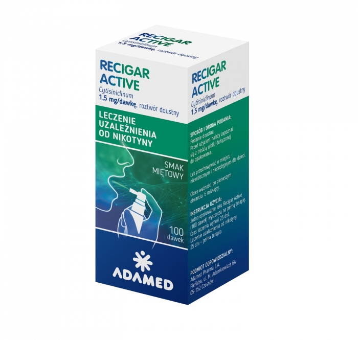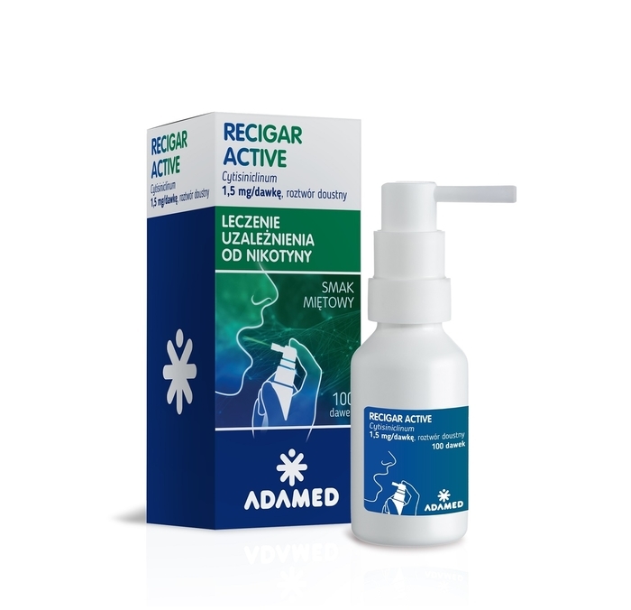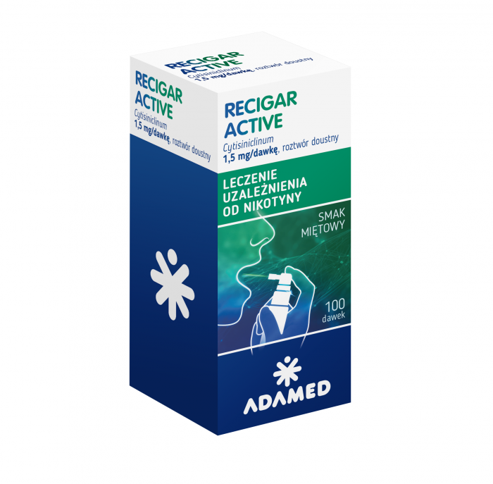 RECIGAR ACTIVE to lek dla dorosłych stosowany w leczeniu uzależnienia od nikotyny oraz w celu zmniejszenia głodu nikotynowego, co wspomaga trwałe rzucenie palenia. Preparat pozwala na stopniowe ograniczenie zależności od nikotyny, łagodząc typowe objawy odstawienia, takie jak chęć zapalenia papierosa, drażliwość, niepokój, zaburzenia koncentracji, bezsenność czy zwiększony apetyt. Substancją czynną jest cytyzyna, alkaloid roślinny, który wiąże się z receptorami nikotynowymi w mózgu, zmniejszając głód nikotynowy i odruch palenia. Recigar Active dostępny jest w formie miętowego sprayu zawierającego 100 dawek, co wystarcza na pełną terapię. Lek wspiera bezpieczne i stopniowe odzwyczajenie się od palenia oraz trwałe zaprzestanie używania produktów zawierających nikotynę.