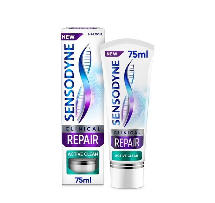 Sensodyne Clinical Repair Active Clean wyrób medyczny z 5% NovaMin® i fluorkiem, który w 2 minuty odbudowuje ochronę nadwrażliwych zębów i zapewnia ulgę.