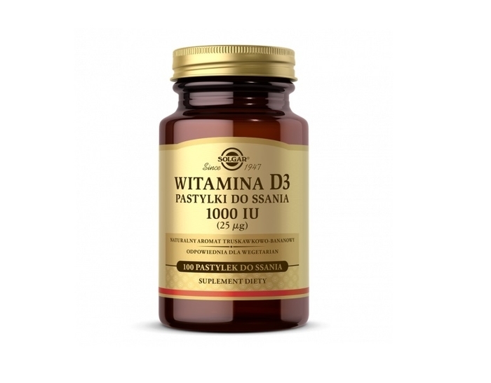 SOLGAR Witamina D3 w formie pastylek do ssania to świetna alternatywa dla suplementacji diety przez osoby, które zażywają dużo preparatów do połknięcia lub mają trudności z połykaniem. Pastylki mają pyszny smak – truskawkowy oraz bananowy. To sprawia, że zażywanie suplementu jest bardzo przyjemne. Witamina D jest niezmiernie ważna dla funkcjonowania organizmu człowieka. Pomaga w prawidłowym wchłanianiu/wykorzystywaniu wapnia i fosforu, utrzymaniu zdrowych kości, zębów, prawidłowego poziomu wapnia we krwi, funkcjonowaniu mięśni i układu odpornościowego. Firma Solgar w trosce o potrzeby i oczekiwania pacjentów, stworzyła preparat w pełni bezglutenowy oraz wegetariański.