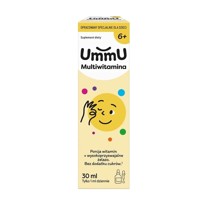 UMMU Multiwitamina 6+ to suplement diety w formie kropli o pysznym pomarańczowym smaku, stworzony z myślą o dzieciach od 6. roku życia. Preparat łączy w sobie zestaw witamin z grupy B, witaminę D oraz innowacyjne mikronizowane i mikroenkapsułkowane żelazo, które nie barwi zębów, nie pozostawia metalicznego posmaku i jest łagodne dla żołądka.