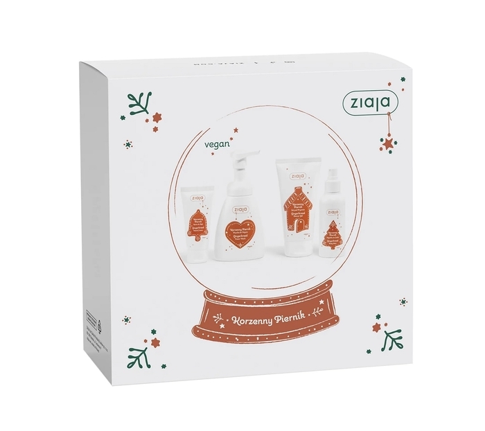 ZIAJA ZESTAW KORZENNY PIERNIK to wegański zestaw do codziennej pielęgnacji ciała i dłoni w zimowe dni. Zawiera piankę do mycia, żel pod prysznic, mgiełkę do ciała i krem do rąk, które delikatnie oczyszczają, nawilżają, zmiękczają i łagodzą podrażnienia, otulając skórę aromatem korzennego piernika. Idealny jako prezent lub do uzupełnienia zimowej rutyny pielęgnacyjnej.