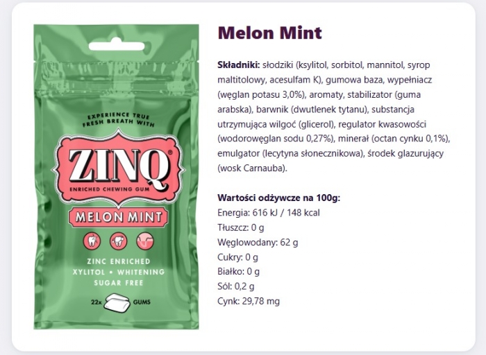 ZINQ Melon Mint to guma do żucia łącząca świeży smak melona i mięty z działaniem składników wspierających zdrowie jamy ustnej. Zawiera octan cynku o właściwościach antybakteryjnych, ksylitol chroniący przed próchnicą oraz mikrogranulki pomagające redukować płytkę nazębną. Bez cukru, bezpieczna dla szkliwa, rekomendowana przez Szwedzkie Towarzystwo Stomatologiczne.